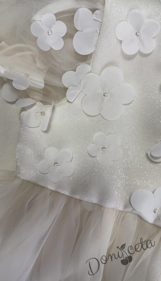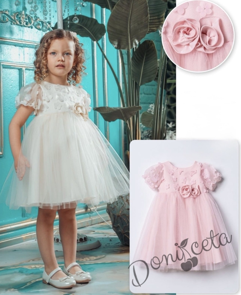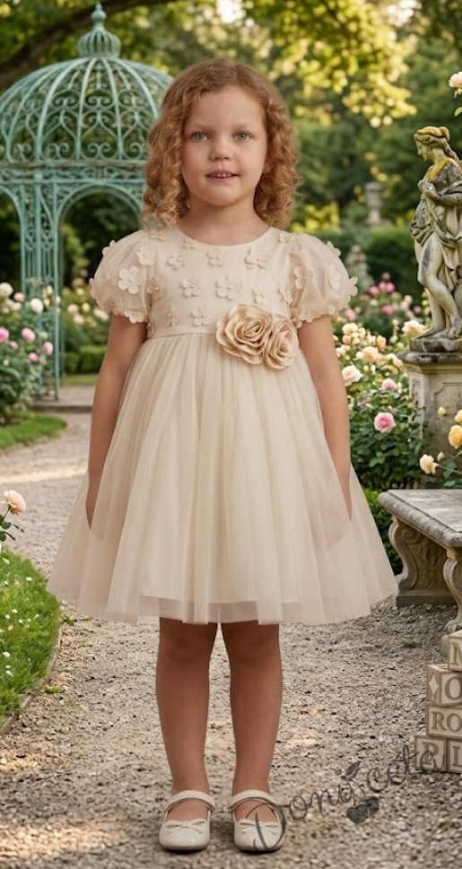 Нежна детска рокля с 3D цветя и тюл в бежово с къс ръкав