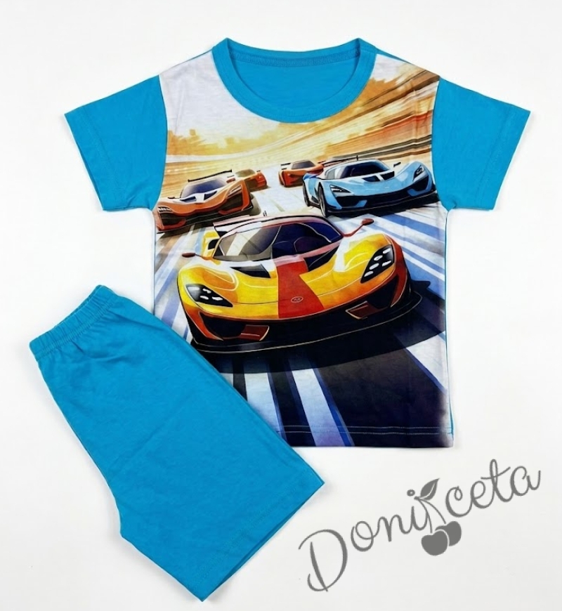 - Детска пижамка за момче с къс ръкав в синьо с коли.