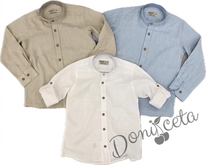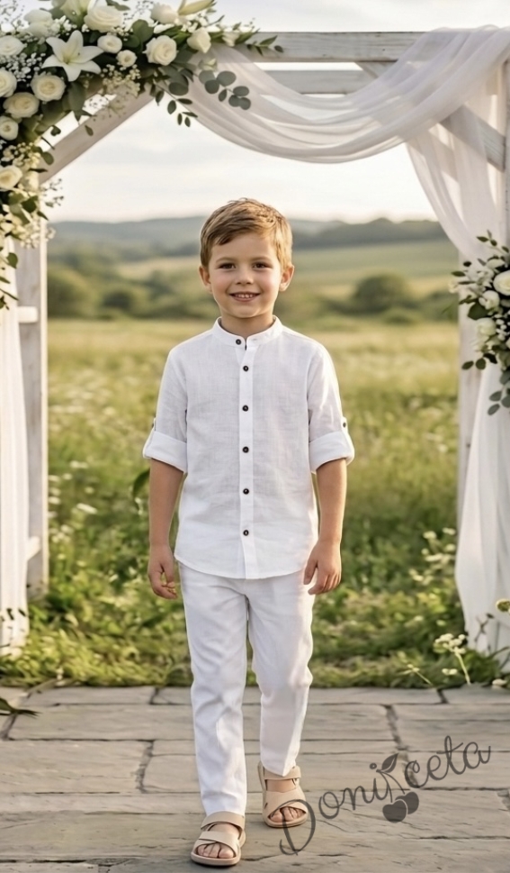 Представяме Ви нашия елегантен и стилен празничен комплект за момче от 2 части- риза в бяло без яка и панталони в бяло.