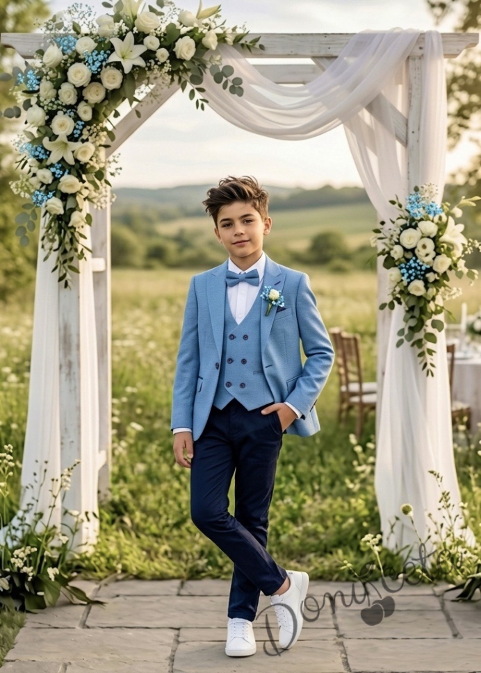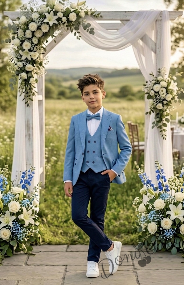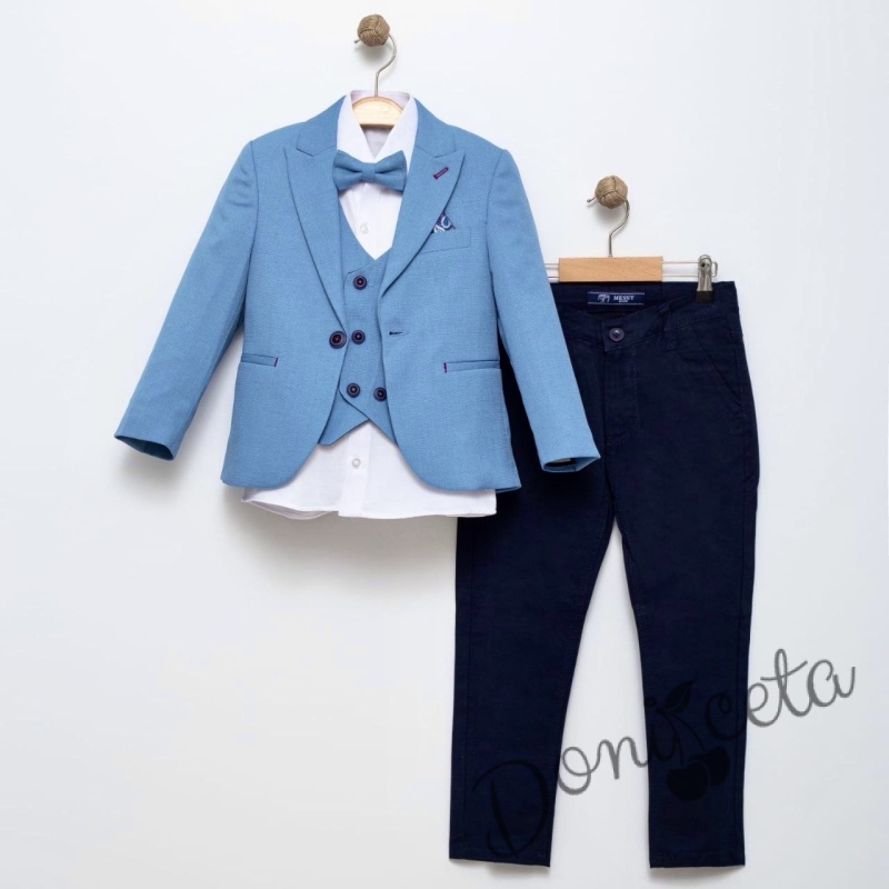 Официален детски костюм за момче от 5 части със сако в синьо и спортно-елегантен панталон в тъмносиньо