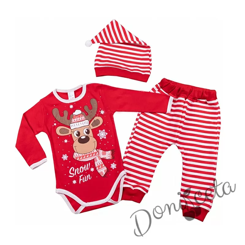 Бебешки коледен комплект от 3 части-боди с еленче, панталони с коледни мотиви и шапка