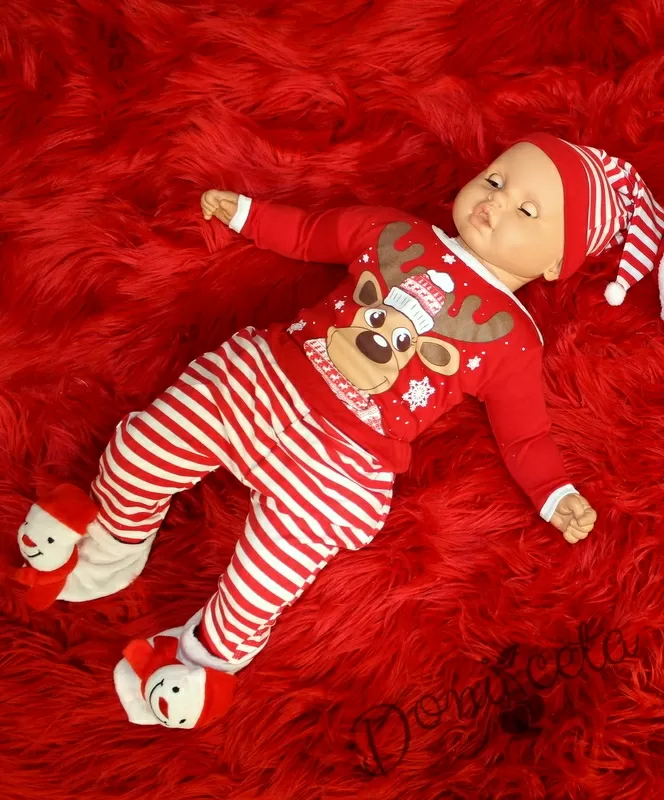 Бебешки коледен комплект от 3 части - боди в червено с еленче и шапка