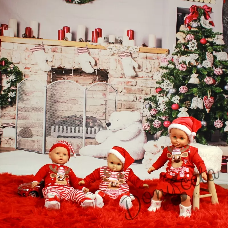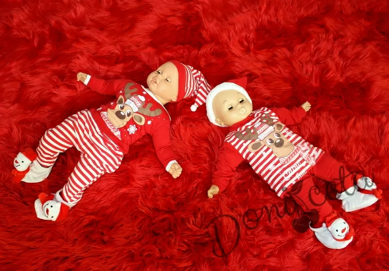 Ватиран коледен бебешки/детски комплект в червено от блуза и долнище с коледни мотиви